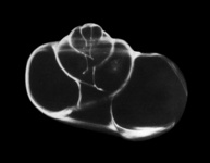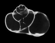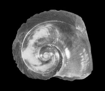 Atlanta fragilis was described by Richter (1993) from material collected from the tropical central Atlantic Ocean. The species shares the same eye, opercular, and radular types with other members of the A. peronii species group. Among these species, it is most similar to A. peronii in overall shell morphology, maximal shell size, and sexual dimorphism in the marginal teeth. The shell of A. fragilis is distinguished from other species by its thin, fragile walls (hence, the specific epithet, fragilis). Richter (1993) noted that the thickness of the wall in the fifth whorl is about 10 µm, compared with 22-25 µm in the fifth whorl in A. peronii. Other differences with A. peronii (cited in Richter, 1993 and in Richter and Seapy, 1999) include: (1) the keel, which is higher and penetrates deeper between the last two shell whorls in A. fragilis, (2) the keel base is clear, lacking pigmentation; in A. peronii the keel base of young individuals is clear, but becomes light brown to dark yellowish-brown with age, (3) the size of the eye lenses in adult animals is more than twice as large in A. fragilis; (4) the radula is longer and wider in A. fragilis, (5) the maximal number of tooth rows is higher in A. fragilis (70 compared with 60 in A. peronii), and (6) the spire of the larval shell is somewhat flatter in A. fragilis (see apertural views of larval shells of A. fragilis [above] and A. peronii [below]); although this difference is not seen in the spire of the adult shell. Lastly, Richter (1993) reported vertical distribution data for A. fragilis from opening-closing MOCNESS net tows taken during METEOR Expedition 51 in the tropical central Atlantic. Of the 135 adult specimens collected, about half were from 0-100 m tows and the other half were from 100-250 m tows. No information was included about the times of the tows, and so the possibility of nocturnal vertical distribution could not be assessed.