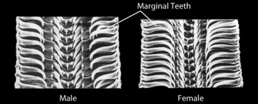 - Sexual dimorphism: marginal teeth shorter and more sharply bent terminally in males than in females