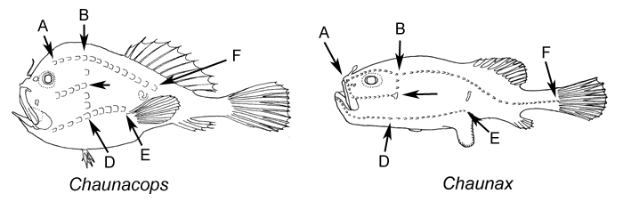 1A. Anal-fin rays 5 or 6 (usually 6); greatest distance between anterolateral angles of sphenotic bones (prominent bumps beneath skin behind eyes) 22 to 27% of standard length; 9 neuromasts in supraorbital row (A-B), 1 neuromast in upper preopercular row (B-C), 2 in lower preopercular row (C-D), 3 in pectoral row (D-E), 17 to 21 in lateral line (B-F) (Chaunacops Caruso, 1989b)