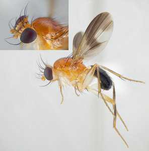 The Clusiidae are a family of small, thin, yellow to black flies with the wing usually partially infuscated. The antenna most readily diagnoses the family: the outer and (sometimes) inner distal margins of the pedicel have a triangular extension, and the arista is dorsoapical (separating it from most other acalyptrate families) on an (frequently) orbicular first flagellomere.