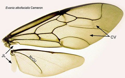 Fig. 2 Evania albofacialis fore and hindwings. JL = jugal lobes, CV = reduction or loss of crossveins, M,CU = hind wing vein.