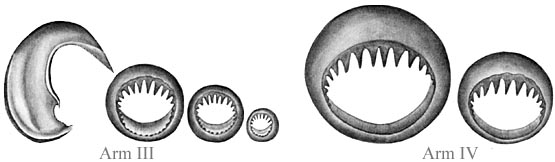 - Mid-region of arms I-III with 2 rows of medial hooks in mid-region (39-48 per arm); arms IV with 2 medial rows of suckers.
