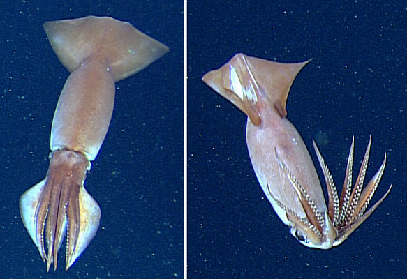 Comments | In situ photograph of Gonatopsis borealis taken at a depth of 366 m (daytime). Note the well developed keels on Arms III and the lack of tentacles. |