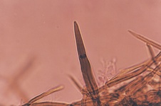 Top: Figure 5: Browinsh basidiome of Phellinus palmicola (Berk. & Curt.) Ryv. Bottom left to right: Figure 6: Clampless generative and browinsh skeletal hyphae of Phellinus gilvus (Schw.) Pat. X40. KOH 5% + Phloxin stained slide. Figure 7: Photomicrograph of hymenial setae of Phellinus palmicola (Berk. & Curt.) Ryv. X40. KOH 5% + Phloxin stained slide. Figure 8: Scanning electron photomicrograph of hooked and straight hymenial setae of Phellinus wahlbergii (Fr.) D.A. Reid. X500. Figures 5, 6, 7 © Aristóteles Góes-Neto. Figure 8 © Cláudia Groposo.