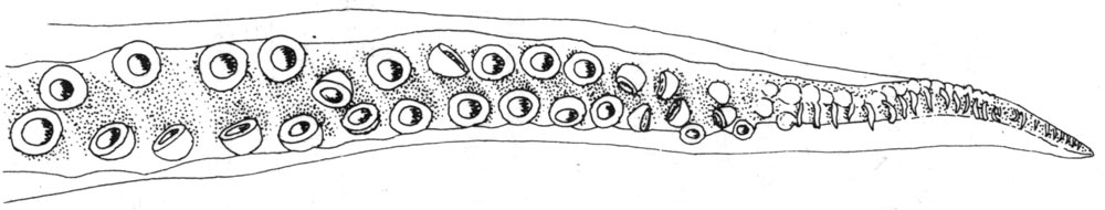 - Middle portion (HA2) with suckers about 3/4 diameter of proximal suckers; oral surface of arm not expanded; sucker rows not abnormally separated; very slight constriction between HA1 and HA2; trabeculae not modified as fringed lobes.