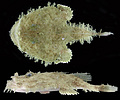- 3B. Dorsal rays 9-12; anal rays 8-10; floor of mouth without dark reticulations; parietal spine prominent; two quadrate spines; a single interopercular spine; vertebrae 26-31 (Lophius Linnaeus, 1758, Atlantic, Western Pacific, and Indian oceans)