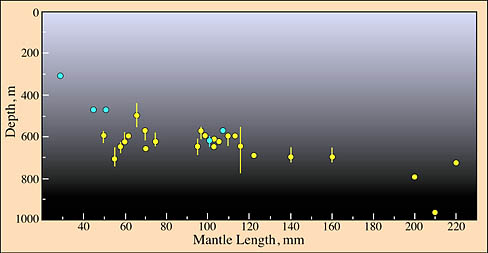 Figure. Vertical distribution of T. belone, Hawaiian waters. Captures were made with both open and opening/closing trawls. Bars - fishing depth-range of opening/closing trawl. Circle - Modal fishing depth for either trawl. Blue-filled circles - Night captures. Yellow-filled circles - Day capture. Chart modified from Young (1975).