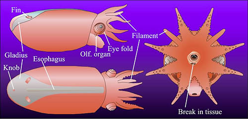 Figure. V. infernalis hatchling, 8 mm ML, captured off Hawaii, 1050-1300 m depth. Drawing modified from Young. and Vecchione, 1999.