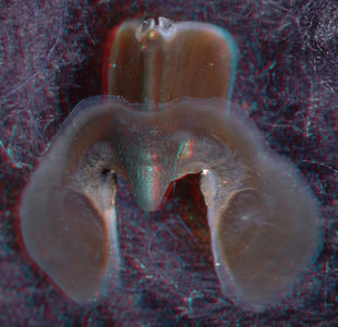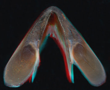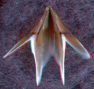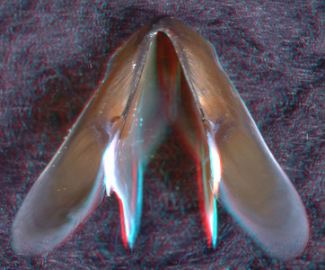 About anaglyph 3D: Photographs here are in 3D, using anaglyph techniques which combines two photographs one in red and the other in cyan (blue + green) color. To get the 3D effect, you must use glasses with red and cyan lenses (filters) over your regular glasses. The form of the beak is far easier to interpret in 3D and we strongly recommend to the viewer that the glasses be obtained (this is especially helpful when viewing enlarged images - i.e. click on the image). These beak photographs were made using Red and Cyan Anachrome Aviator Glasses (see: http://www.anachrome.com/glassbuy.htm or http://www.amazon.com) which cost under $10.00 (USD).